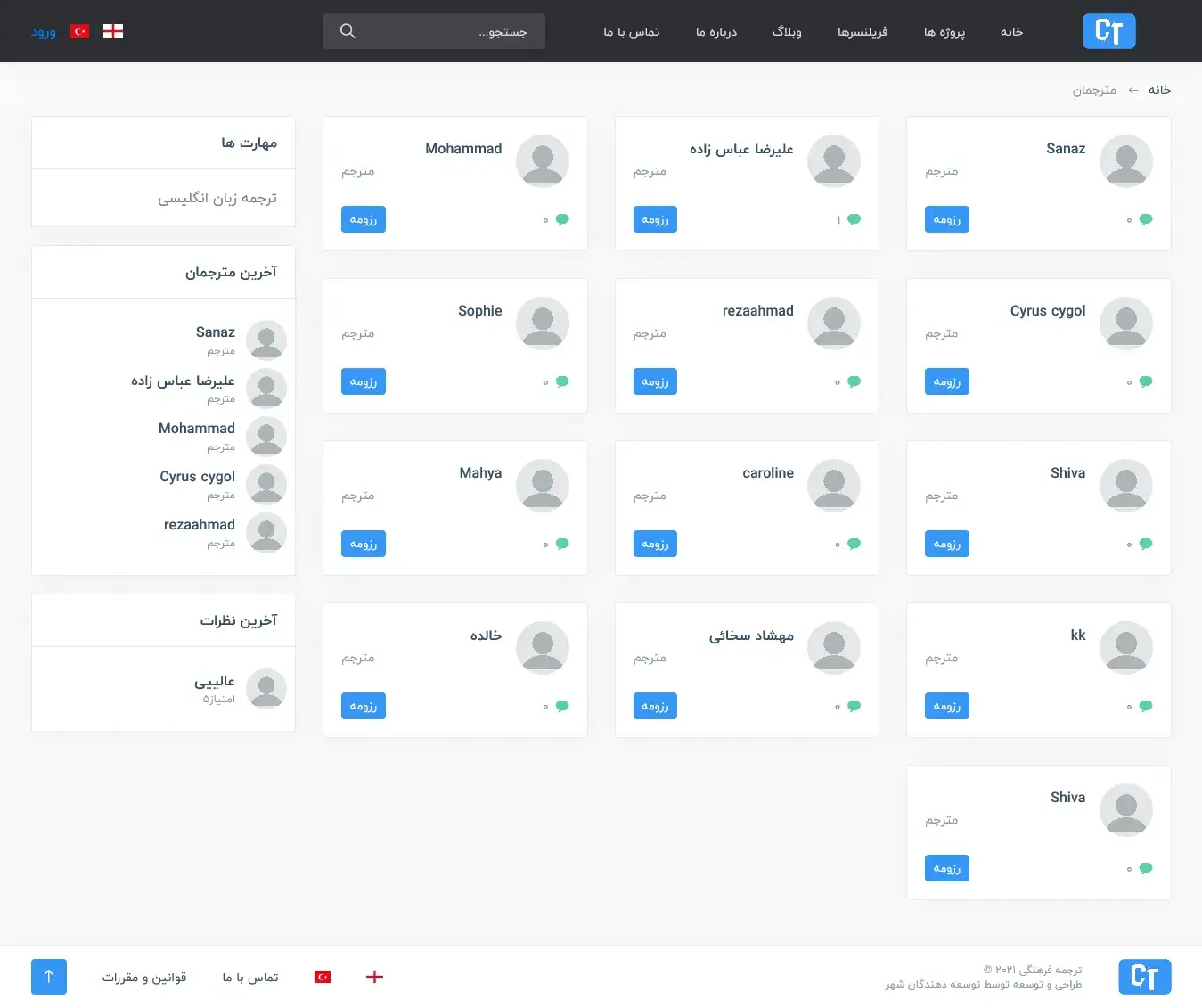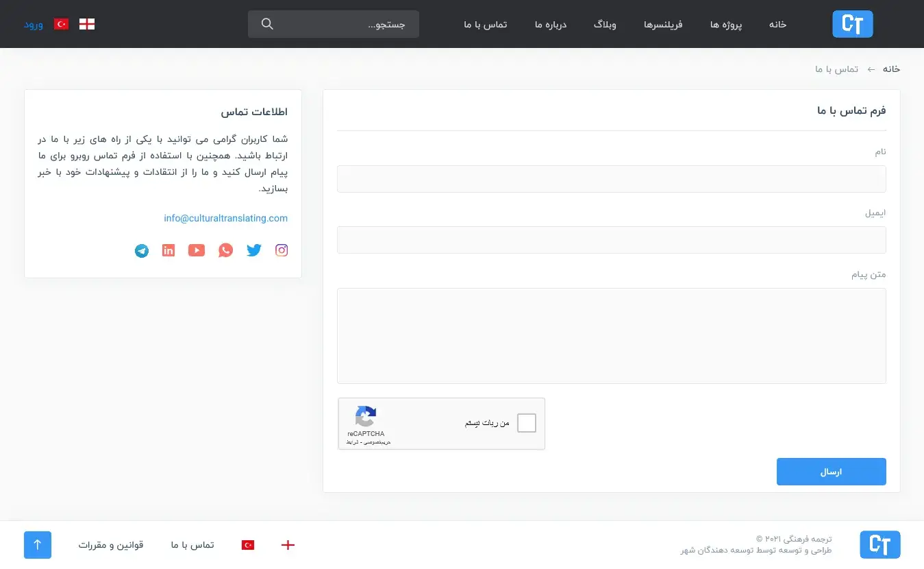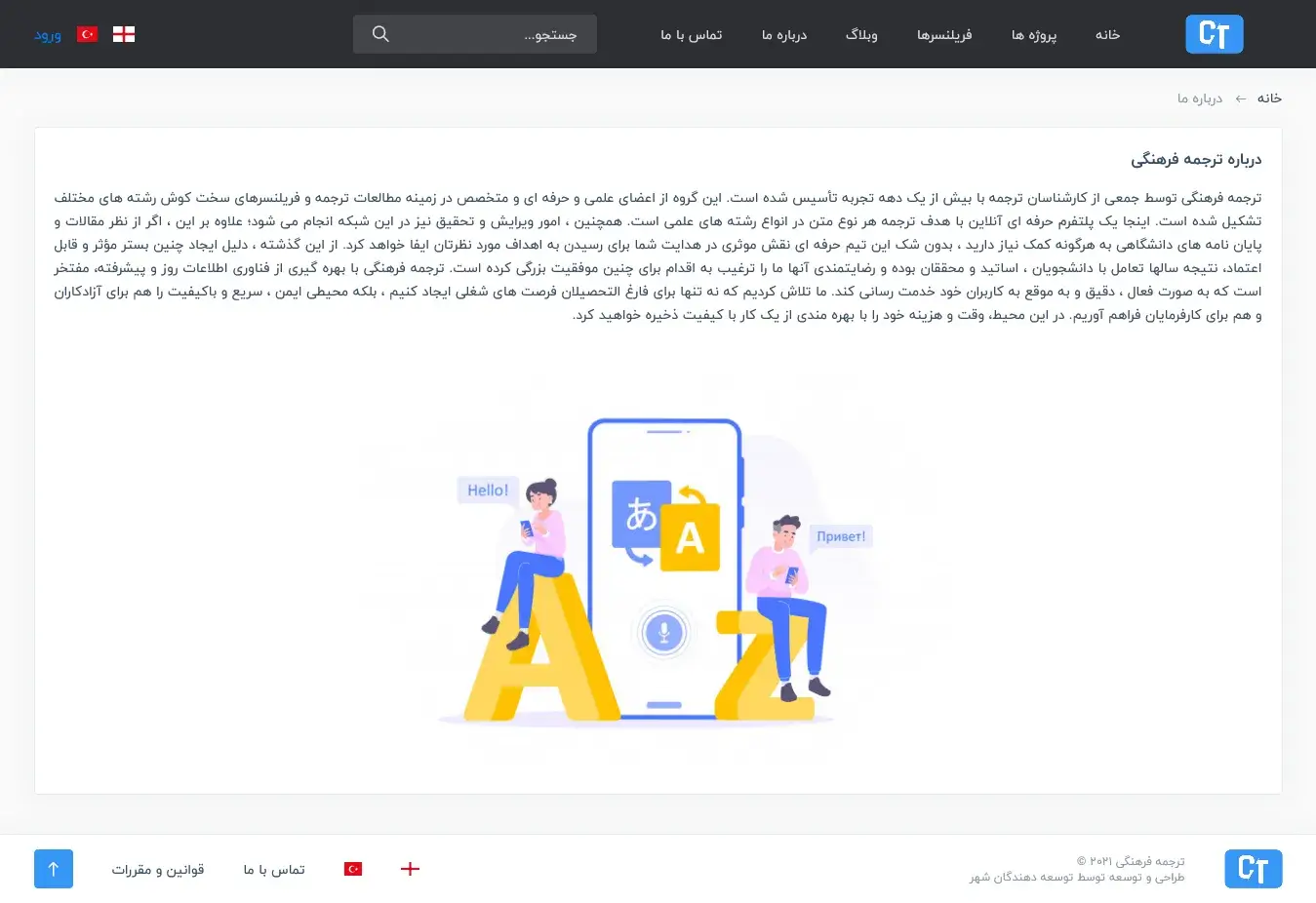 ترجمه فرهنگی یک وب سایت دورکاری ترجمه متون انگلیسی و سایر زبان ها می باشد. این وب سایت به صورت اختصاصی برای ترجمه فرهنگی توسط توسعه دهندگان شهر اجرا شده است.