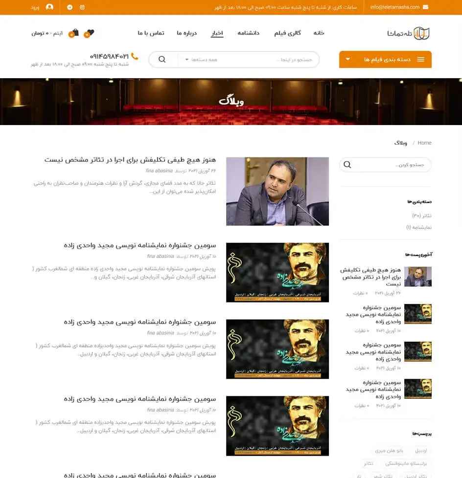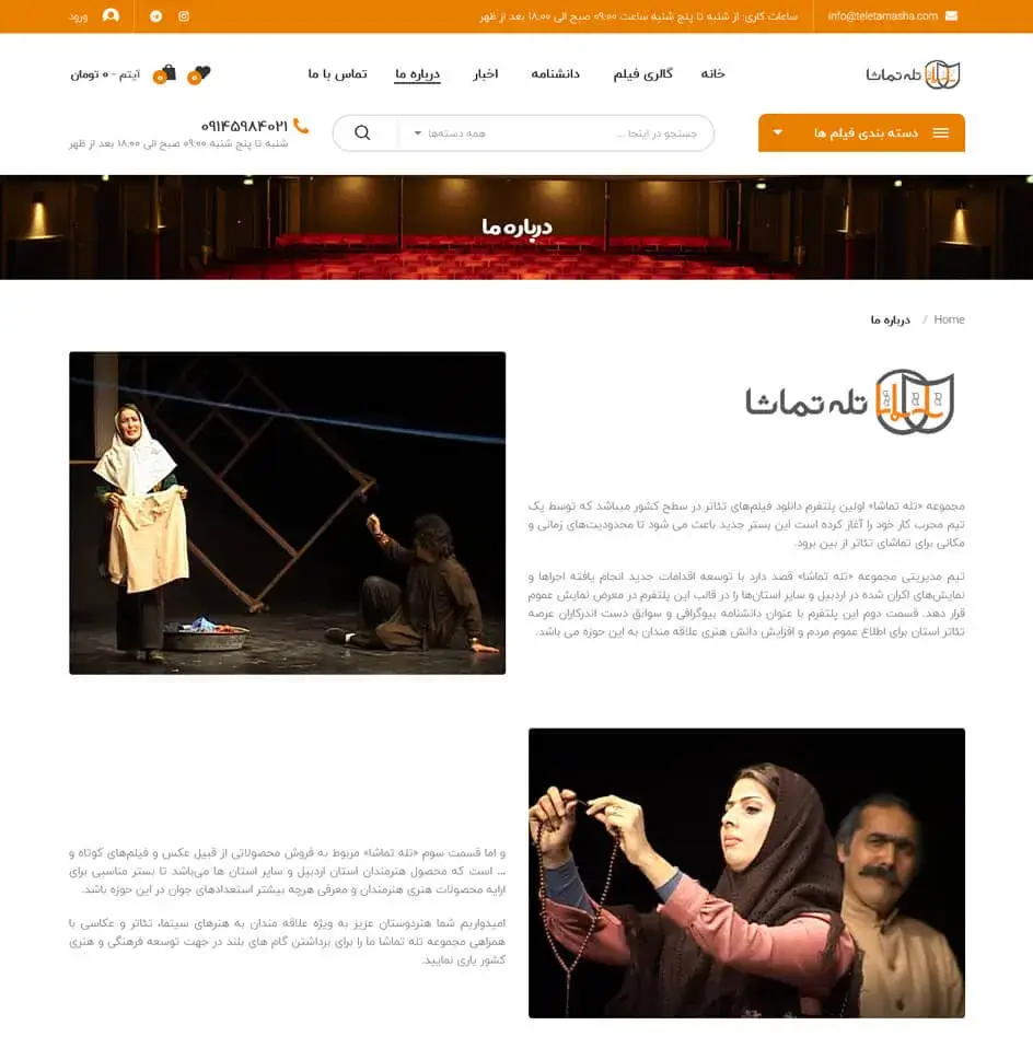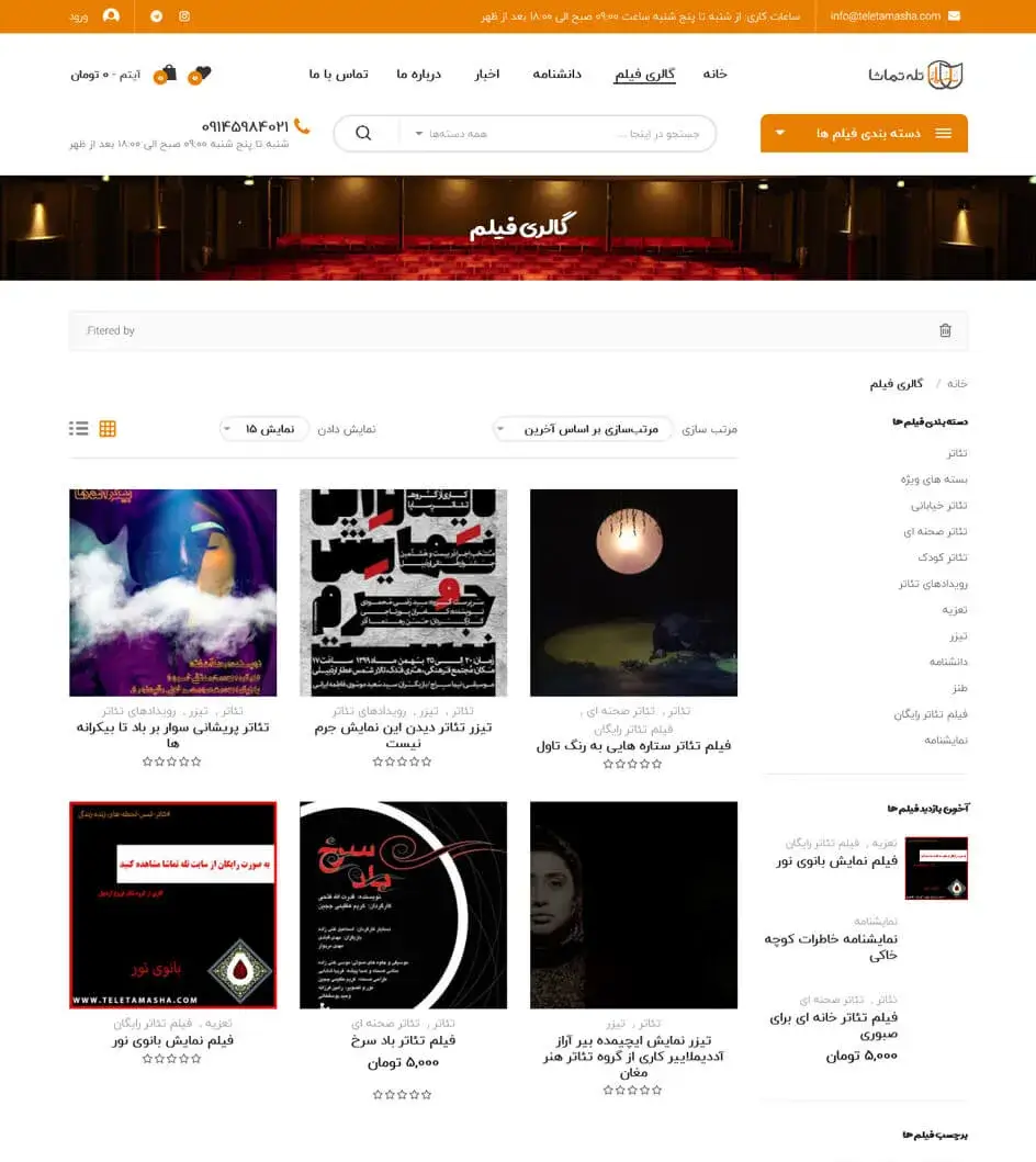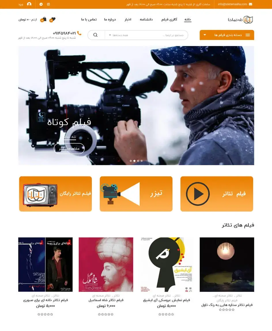 این وب سایت یک پلتفرم آنلاین فروش فیلم تئاتر، کوتاه، طنز و تعزیه می باشد. این پروژه به صورت اختصاصی توسط گروه نرم افزاری توسعه دهندگان شهر به مرحله اجرا در آمده است. این وب سایت شامل آخرین و بروزترین فیلم های تئاتر از سراسر کشور می باشد. این گنجینه های ارزشمند با پرداخت مبلغی اندک قابل دانلود می باشند. به صورت ویژه ای از فایل های دانلودی این وبسایت حفاظت می شود تا امنیت آن در حد مناسبی قرار گیرد.