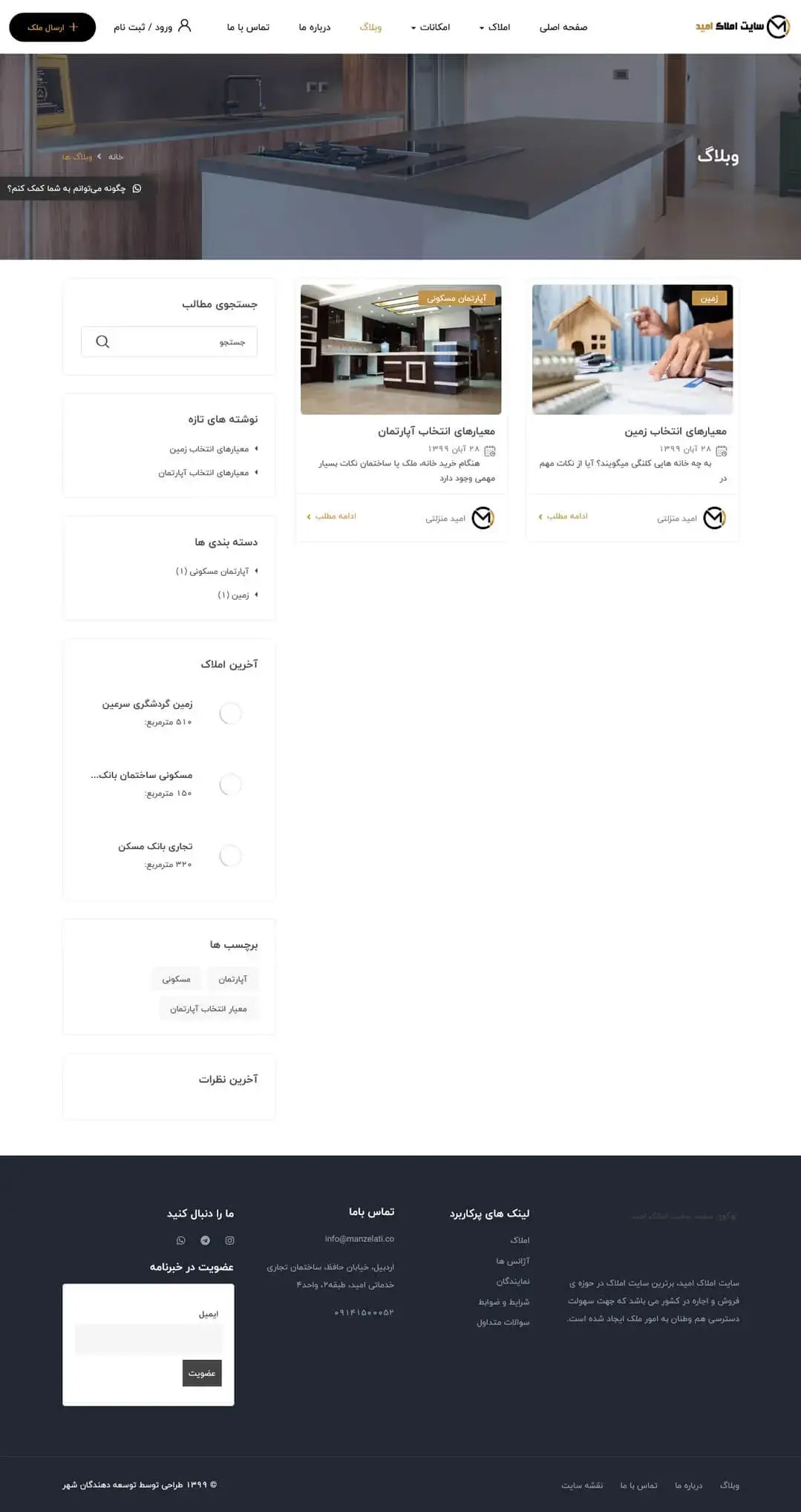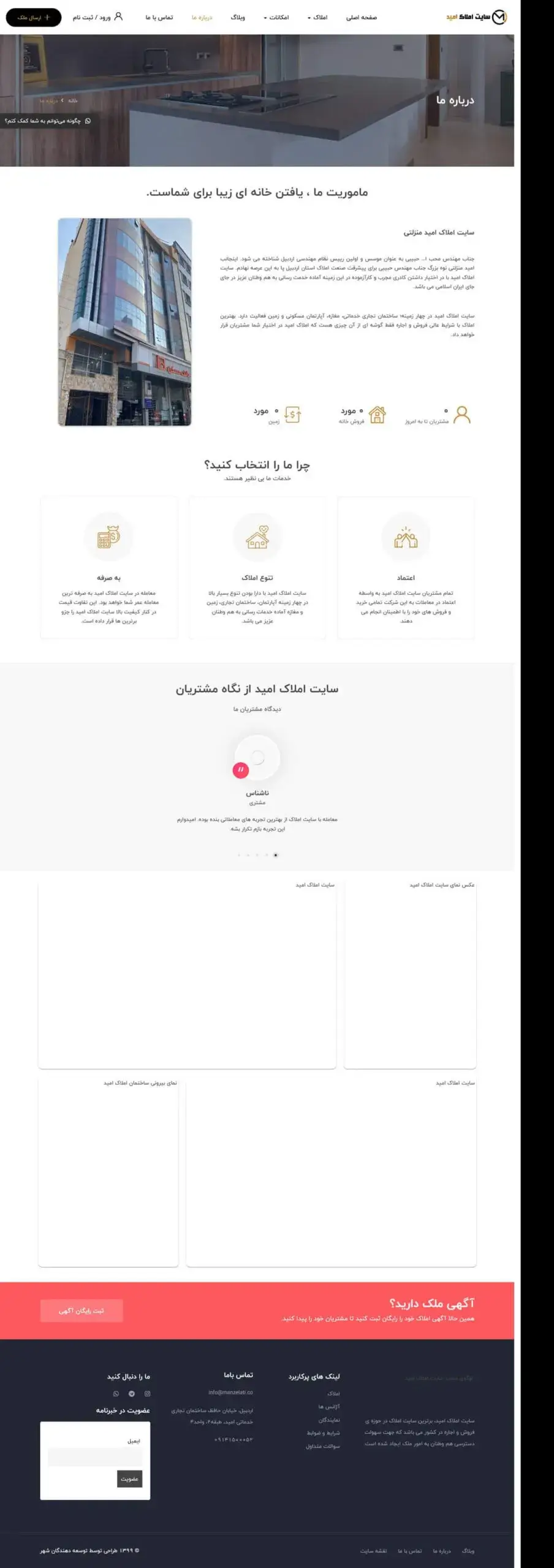 سایت املاک امید یک وب سایت شرکتی می باشد. این وب سایت مرکز تخصصی املاک آنلاین در ایران می باشد. این وب سایت به صورت اختصاصی برای املاک امید اردبیل توسط توسعه دهندگان شهر اجرا شده است.